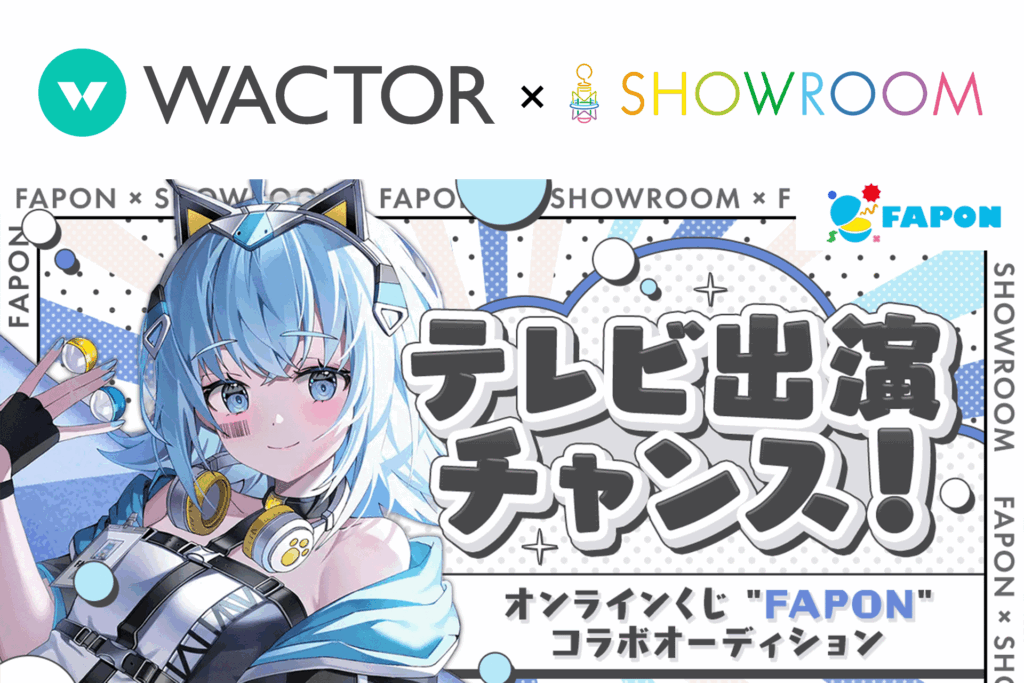 VTuber事務所としては初となる、自社「オンラインくじ”FAPON”」サービスを軸に、SHOWROOM株式会社(本社:東京都渋谷区、代表取締役社長:前田裕二)が運営する仮想ライブ空間「SHOWROOM」にて、最大でテレビCMを含む豪華景品を用意したイベントを開催が決定したことをお知らせいたします。