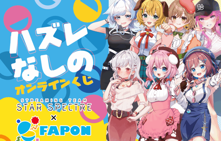 VTuber事務所としては初となる、自社「オンラインくじ”FAPON”」サービスにてVTuber事務所”すたすぺ STAR SPECTRE”全VTuberと描き下ろしイラストによるタイアップが決定したことをお知らせいたします。